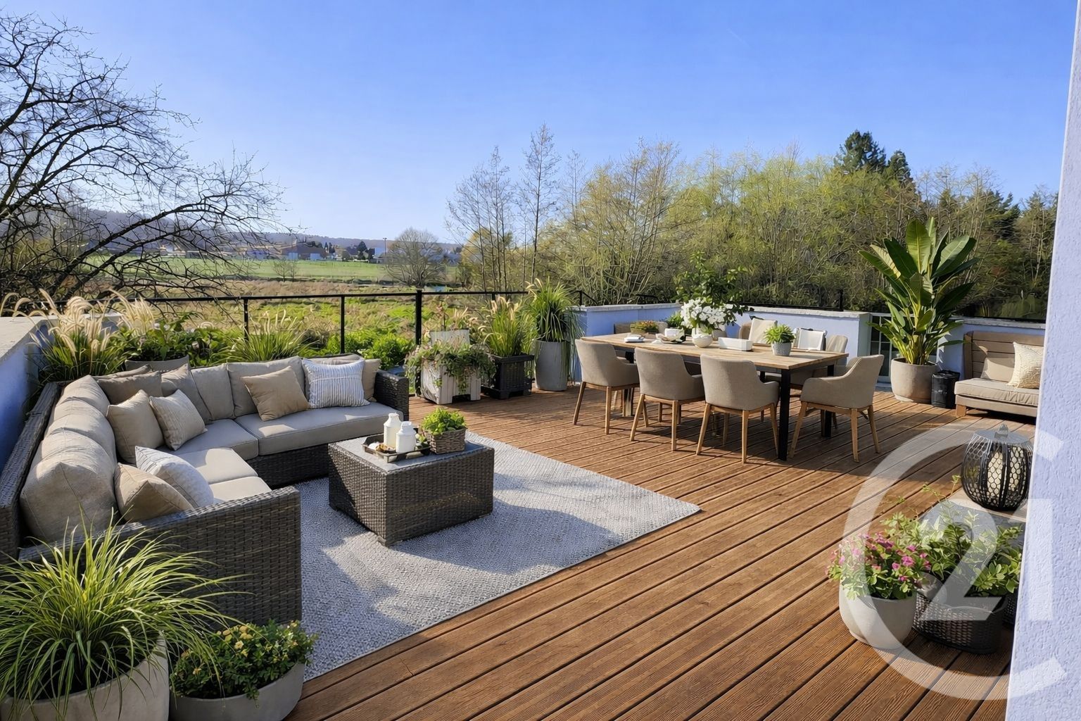 Un garage de plus de 30 m² complète ce bien, offrant un vaste espace de stationnement et de rangement. À l'extérieur, vous profiterez d'une immense terrasse exposée plein sud, accessible directement depuis la pièce de vie, parfaite pour savourer des moments ensoleillés tout au long de l'année.